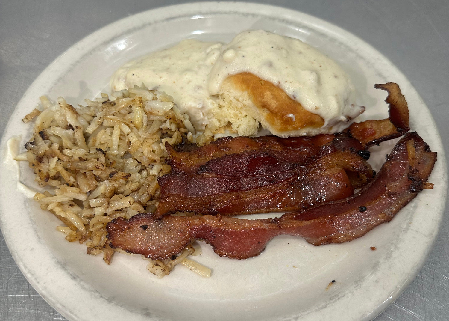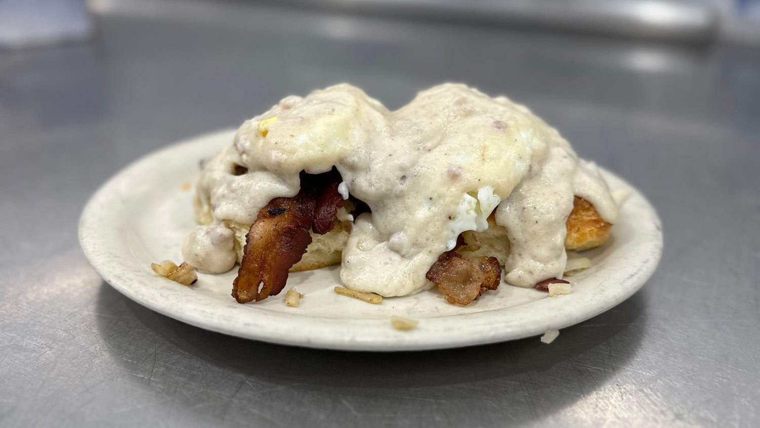 Tender biscuit stacked with hashbrowns, bacon or sausage, and two fried eggs, all smothered in homemade sausage gravy