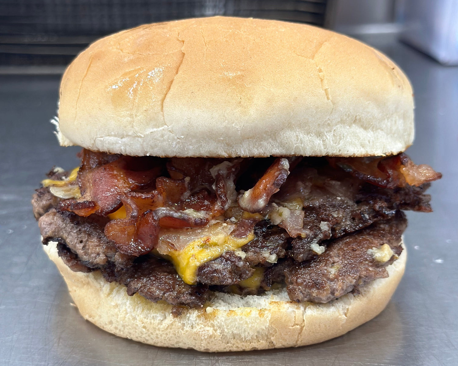 Crispy-edged smash burger topped with garlic butter and finished with crispy bacon.