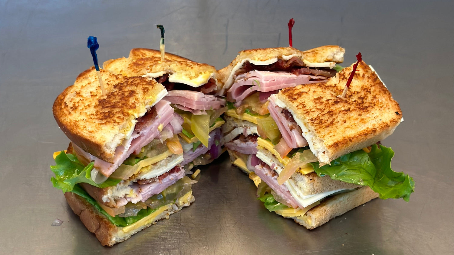 A big, classic club stacked high with meats, cheeses, and fresh veggies on grilled sourdough—priced right at only $8.99